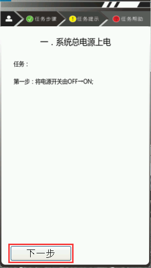 4、用户根据任务步骤依次完成相应设备的开机操作,每完成一个设备的开机操作,点击任务步骤窗口下方的下一步按钮,使其提示内容切换到下一个设备。(如果未完成任务点击了下一步,会提示任务未完成)。具体如图2-10所示。