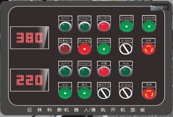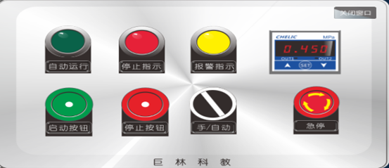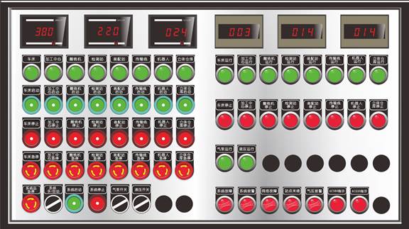 先点击气泵开关,气泵运行灯亮,再点击液压开关,液压运行灯亮。之后一次点击车床急停、加工中心急停、雕铣机急停、检测站急停、装配站急停、传输线急停、机器人急停、立体仓库急停等8个急停按钮。对应的停止灯会灭,同时系统报警蜂鸣灯停止闪烁。