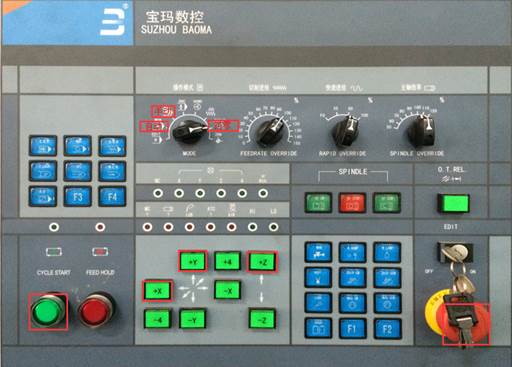 3、 点击加工中心中的回零旋钮,让加工中心进入回零模式,然后依次点击+Z、+Y、+X按钮,按钮依次亮起。