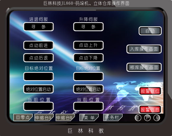 仓库单机界面左侧2列功能划分,进退伺服一列为堆垛机X轴操作,分别包括寻参、点动前进、点动后退3个按钮、目标绝对位置和当前位置2个坐标点;升降伺服一列为堆垛机Z轴操作,分别包括寻参、点动前进、点动后退3个按钮、目标绝对位置和当前位置2个坐标点;单机操作界面中最后一行为堆垛机Y轴操作,包括会零点、神缩台A、神缩台B等3个按钮。右下侧2个红色操作键为报警功能,分别为报警复位和报警信息按钮。